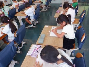 1年生は国語「やくそく」の学習をしています。授業のはじめに前回までの振り返りを行い、今日のめあて「どうして けんかをやめたのか かんがえよう」について考えました。子供たちは、あおむし(ピンク、黄、緑)と大きな木の気持ちを考えながら学習を進めていました。どの子も一生懸命学習に取り組んでいました。