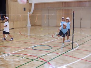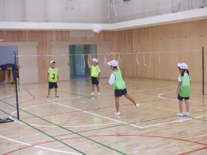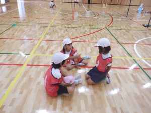 2年生は、スローキャッチゲーム(ボール投げ入れゲーム)をしていました。はじめにチームごとに投げる練習をしていました。どのチームも、袋のボールをフラフープの的に入るように、一生懸命練習していました。スローキャッチゲームでは、袋のボールが相手コートに落ちれば得点になります。はじめの練習を生かして投げ入れていましたが、相手にキャッチされてしまう場面もありました。どうしたら得点できるかをチームで考えながらゲームをしていました。