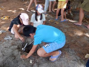5年生は、総合的な学習の時間「カメ学習」で、扇浦海岸に行きました。今日は、カメの産卵後の産卵場所の調査に行きました。はじめに4つのグループに分かれて、自分たちで産卵場所跡を見付けました。見付けたら、みんなで協力して掘り始めました。掘っていくと、卵のかけらや死卵などがあり、産卵後の様子が分かったようです。みんな興味・関心をもって取り組んでいました。
