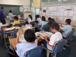 6年生は、社会「戦国の世から天下統一へ」の学習で、今日は「織田信長は、戦国大名たちとどのように戦ったのか」について調べていました。子供たちは、社会科資料集や教科書、図書館資料などを読んだり、タブレット端末で調べたりして学習していました。子供たちは、社会科の調べ学習の仕方を身に付けているようです。どの子も集中して取り組んでいました。