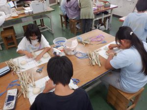 6年生は総合的な学習の時間にタコノ葉細工を学習しています。今日もタコノ葉細工研究会の皆さんに来校いただき、指導してもらっています。子供たちは、タコノ葉をしごいて伸ばして編んでいきます。隙間のないように編むのがコツだそうで、結構難しいようです。でも、みんな真剣に取り組んでいます。