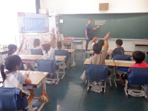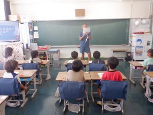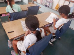 1年生は、算数でひき算のカードづくりを行っていました。はじめに先生が同じカードを使って切り方の指導をしました。そのあと、子供たちは、はさみを使って上手にカードを切り、そのカードを机の上に並べました。並べたカードで計算のきまりを見付けて、みんなで確かめ合いました。みんな集中して学習していました。