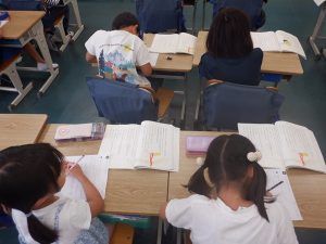 2年生は、国語「みきのたからもの」の学習をしていました。めあては、「お話のあらすじをまとめよう」でした。子供たちは、「だれが」「何をしたのか」「どんなできごとがおこったのか」などを、ワークシートに簡単に書きだしていました。みんな教科書をよく読んで考えていました。