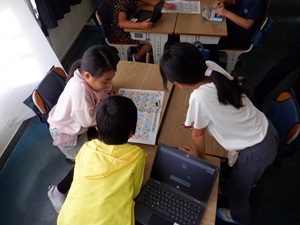 3年生は、みんなで2学期の振り返りをしていました。子供たちはグループに分かれて、「学期ふりかえり×かかわりすごろく」で楽しみながら振り返っていました。よく笑ったできごとや心に残った勉強、できるようになったこと、ありがとうを送りたい人は?など、いろいろな振り返りの質問がありました。お互い振り返りが共有できるのでとても良い活動です。