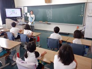 2年生は、朝の時間にスライドを見ながらバリアフリーについて考えました。スライドの中には、父島で見られる点字ブロックやスロープなどの紹介もありました。子供たちは、養護教諭の話やスライドから、身近なところにバリアフリーがあることを知りました。最後に心のバリアフリーについての話もありました。