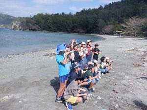 学校記事 5年生 総合的な学習の時間「アオウミガメの学習~放流~」 2026/03/05 5年生は、宮之浜で今年一年間育てたアオウミガメを放流しました。一人一人記念写真を撮ってから、全員で放流をしました。放流するときには、「アオウミガメの旅」をみんなで歌って「また、かえっておいで。」と送り出しました。